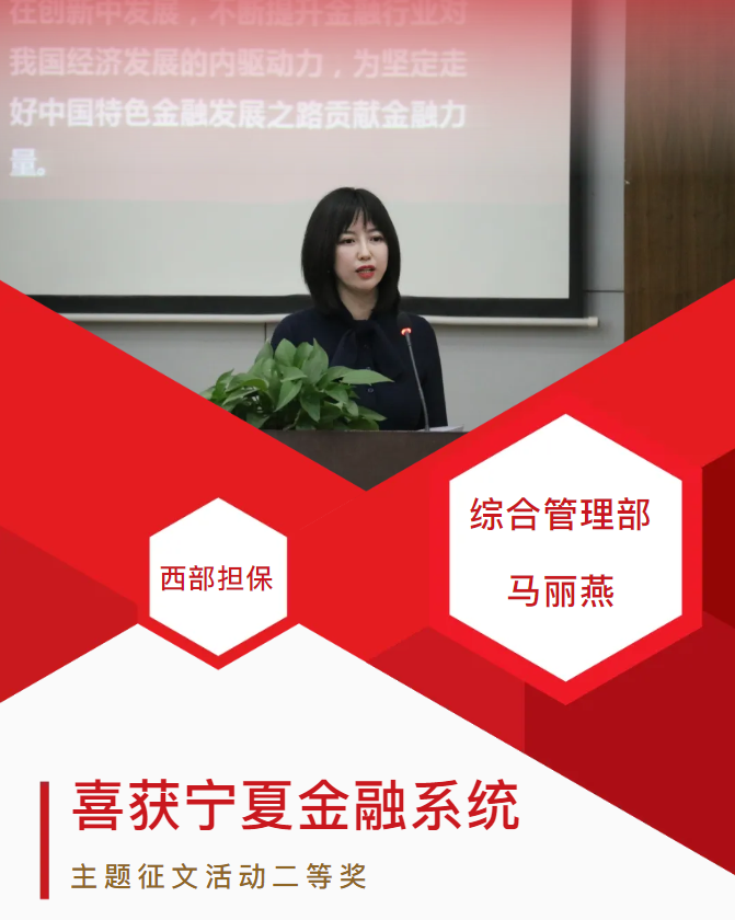 本次活动旨在深入学习中央金融工作会议精神,推动中华优秀传统文化在金融领域内创造性转化和创新性发展,通过征文和演讲的形式,激发金融系统党员、干部的学习热情和创新思维。自活动启动以来,全区金融系统踊跃报名参与,共征集理论文章、心得体会、经验案例、调查研究等不同体裁作品164篇,经专家匿名评审,层层遴选,我公司综合管理部负责人马丽燕撰写的《论金融文化对担保机构发展的促进作用》获得主题征文二等奖,并受邀作现场宣讲展示。
